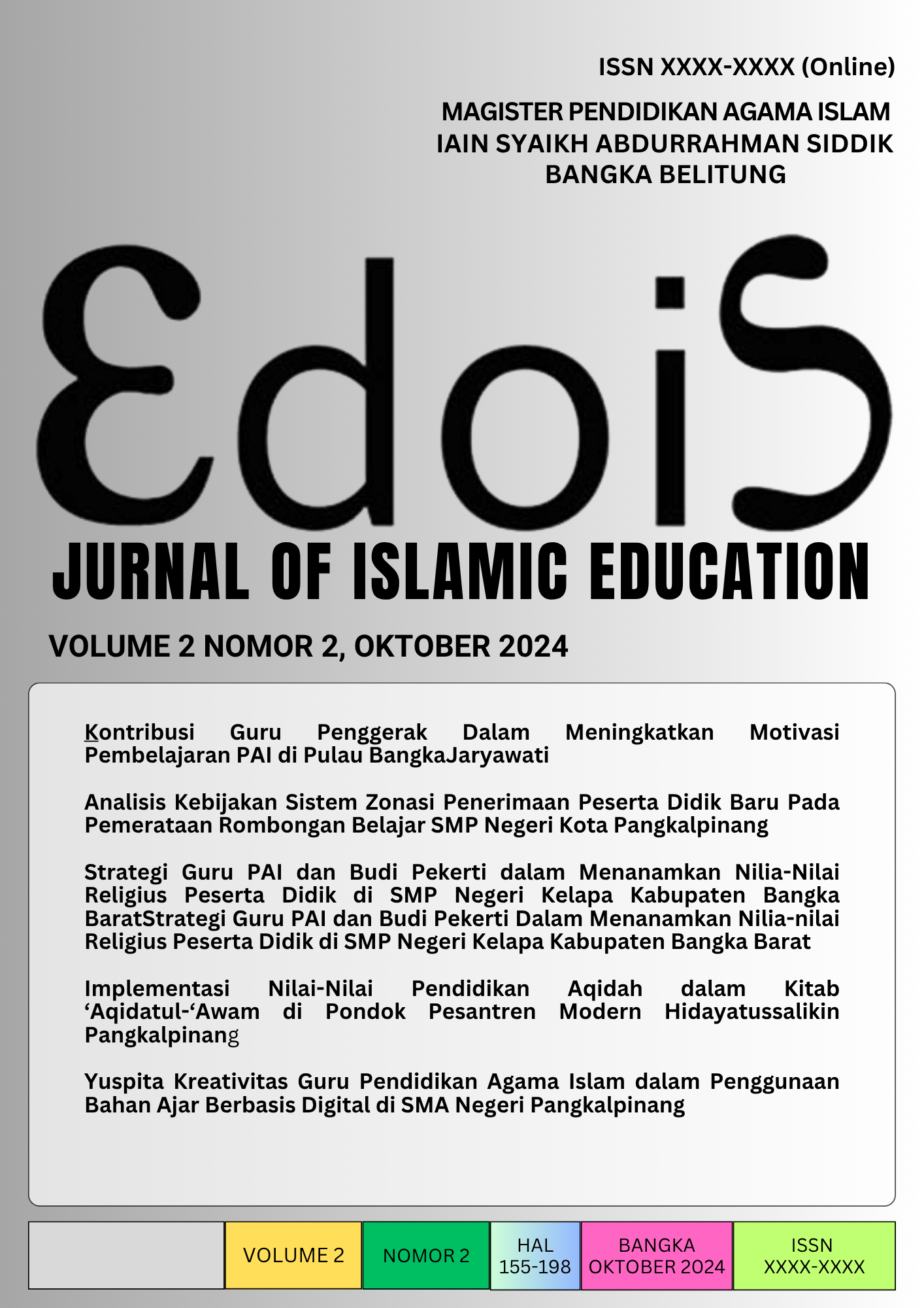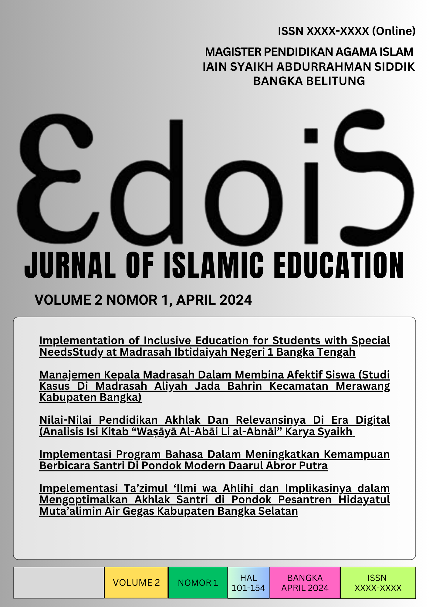 Vol. 1 No. 1 (2023)In this initial issues, we provide the following articles: 1) Keunggulan Pembelajaran Seni Baca Al-Qur’an Di Pondok Pesantren Nurul Falah Airmesu Timur; 2) Pengaruh Kepemimpinan Dan Motivasi Kerja Kiyai Terhadap Kinerja Guru Di Pondok Pesantren Modern Hidayatussalikin Pangkalpinang Bangka Belitung; 3) Dekonstruksi Konsep Moderasi Beragama Dalam Proses Pembelajaran; 4) Dekonstruksi Konsep Moderasi Beragama Dalam Proses Pembelajaran 5) Implementasi Dan Implikasi Proyek “Madrosati Jannati” Dalam Meningkatkan Akhlakul Karimah Peserta Didik Sd Segeri 24 Muntok Kabupaten Bangka Barat
